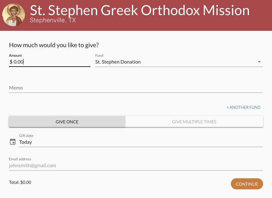 To donate to our mission please click here. You will be directed to an online giving platform that is managed by our sponsor parish, St. Demetrios Greek Orthodox Church in Fort Worth. They are assisting St. Stephen Mission in managing giving and reporting of donations so there is transparency in our stewardship, as well as assistance to you in reporting your charitable contributions. The online giving platform will look like the image below so that you know you are giving to our ministry to the glory and honor of God through the St. Stephen Orthodox Mission.